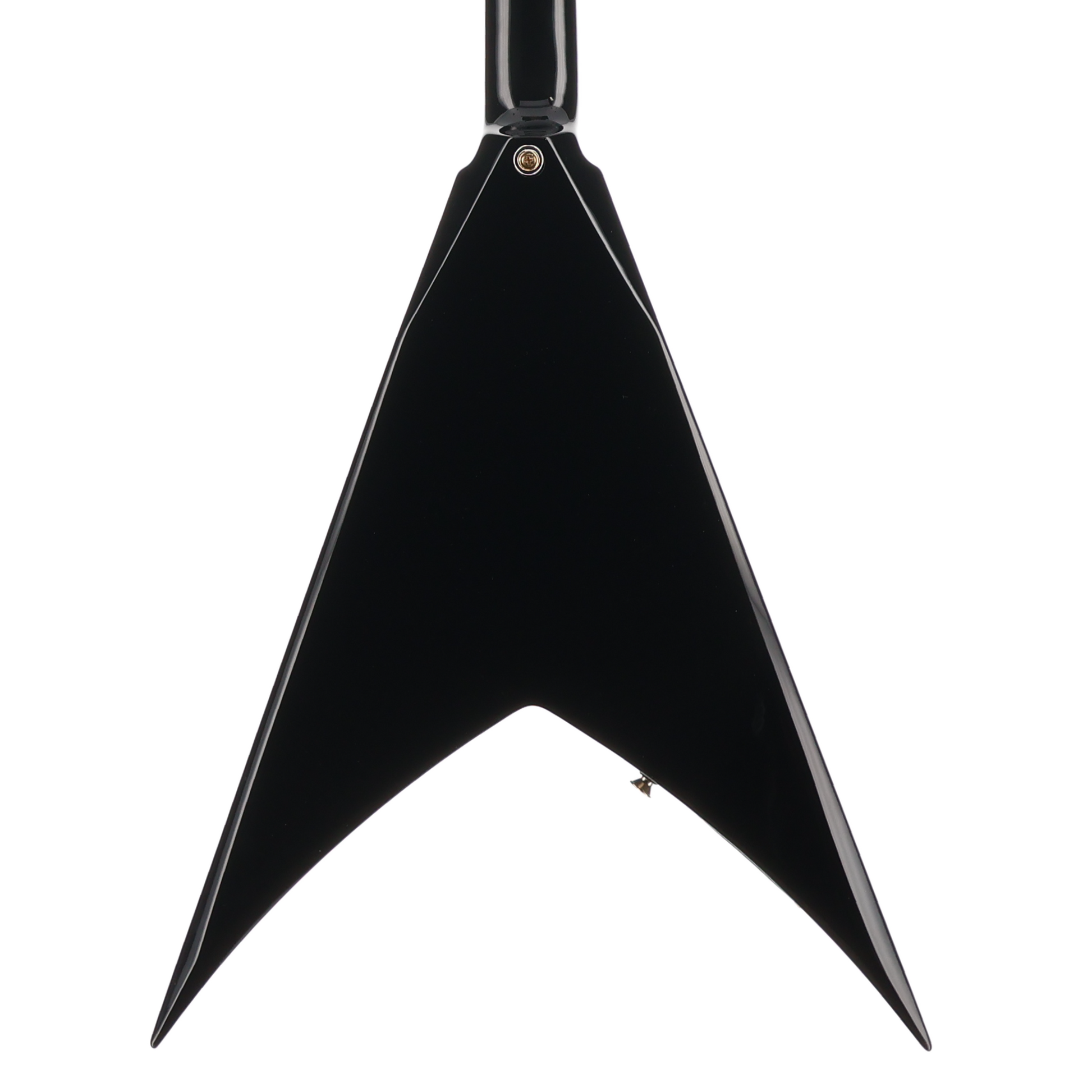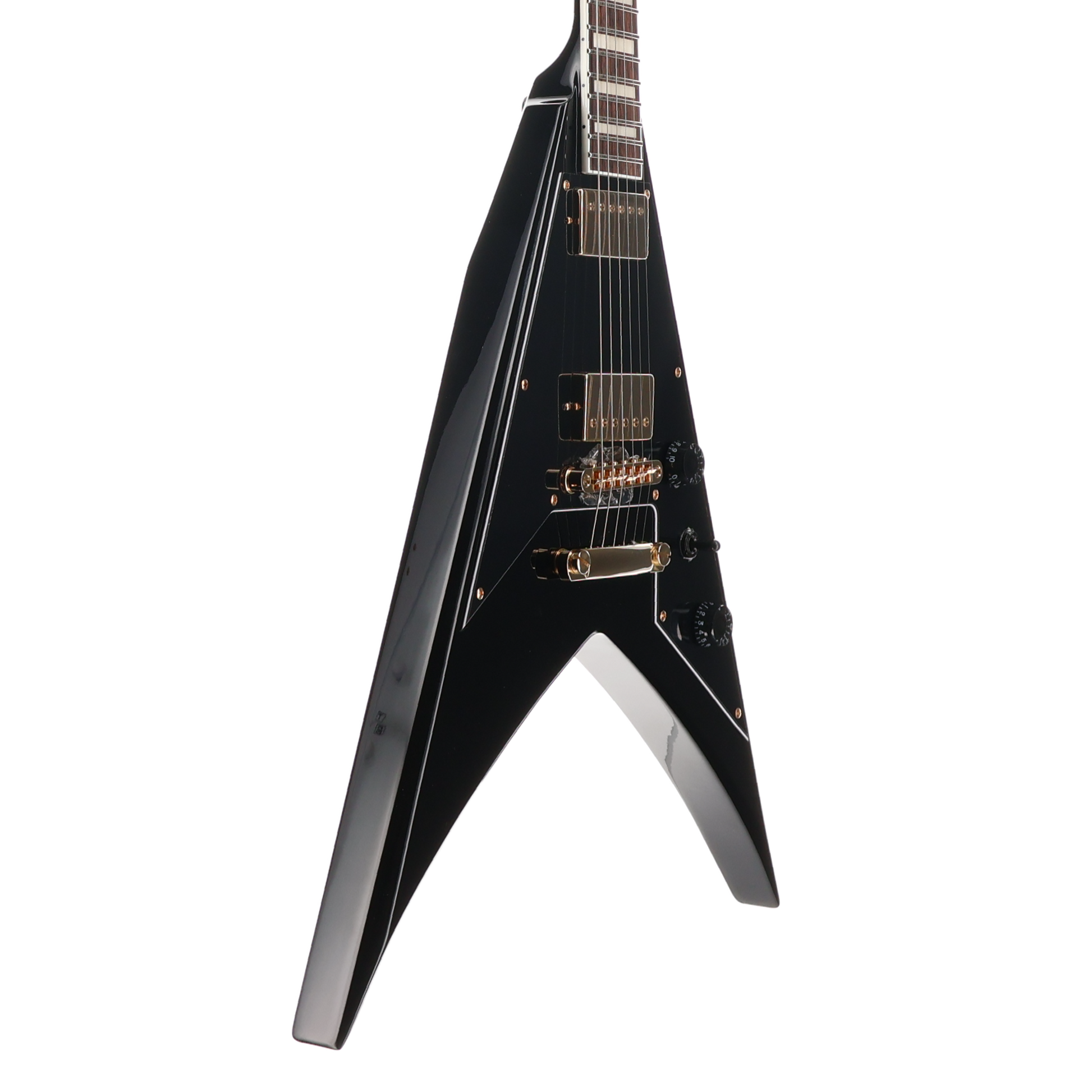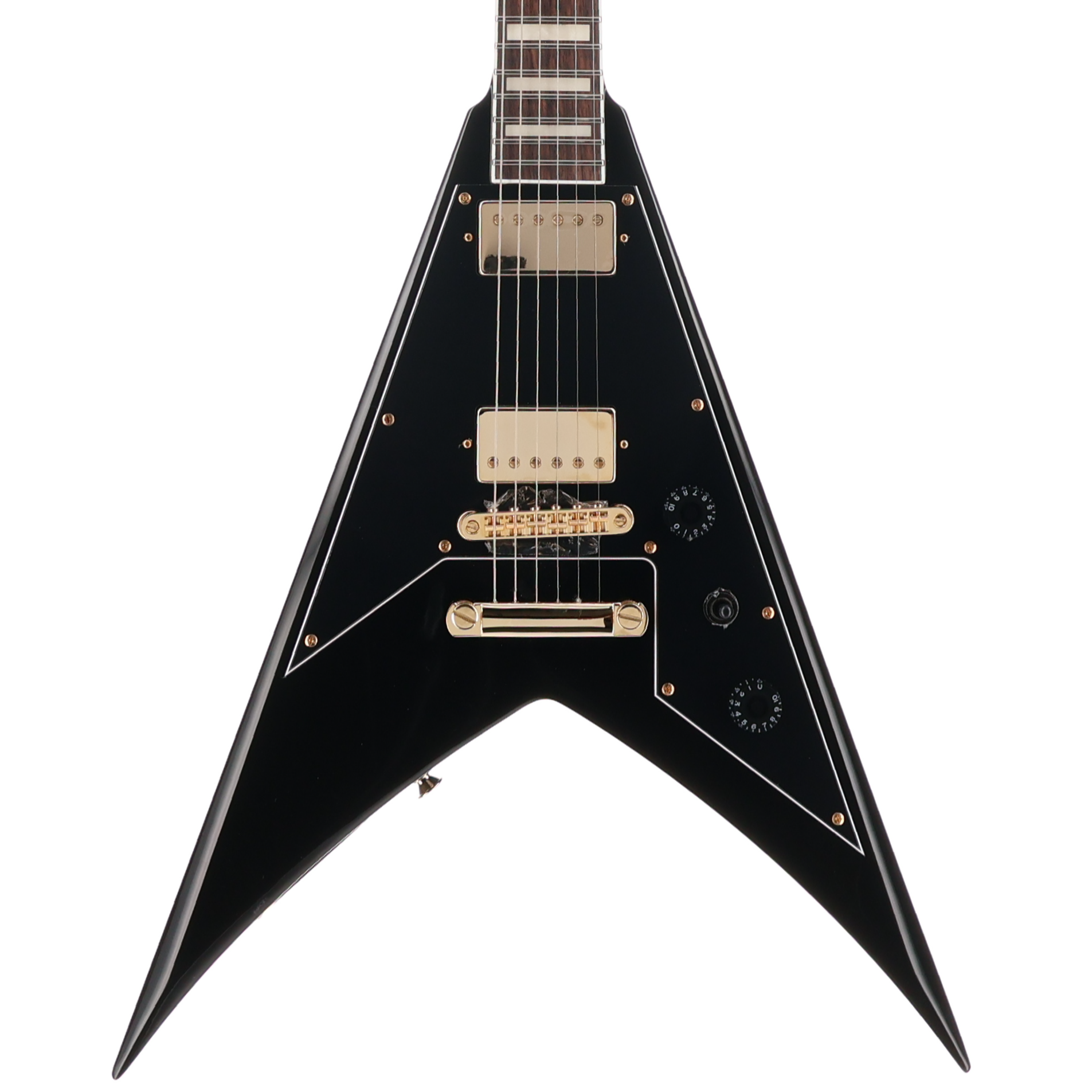 This signature axe also features a Jackson compensated and adjustable TOM-style bridge with anchored tailpiece, Jackson die-cast tuners and pointed 6-in-line-headstock. The KVXT is available in (NEW!) Gloss Black with a three-ply black pickguard - all accentuated with gold hardware, black speed knobs single volume and tone controls and a black three-way toggle switch.